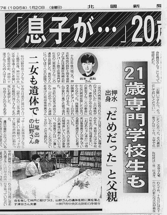 パニックのような電話の不通状況の中で困難を極めましたが、17・18・19日は、学生の「安否確認]および下宿生の確保と実家への送り出しに追われました。直接または伝聞によって、おおむねの無事が確認できたのですが、しかし、下宿先のアパートの倒壊によって学生1名(岡本英和君/法律学科一回生・石川県羽咋郡出身)を失いました。無念の思いが、日に日に強くなります。