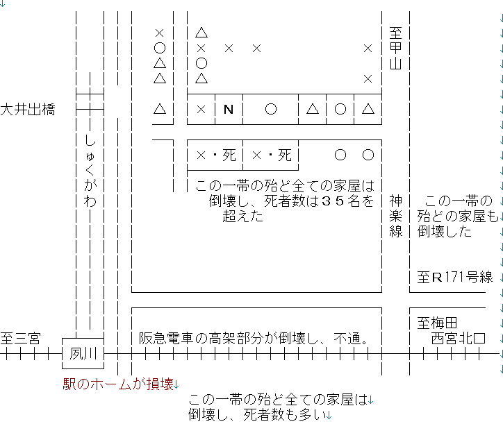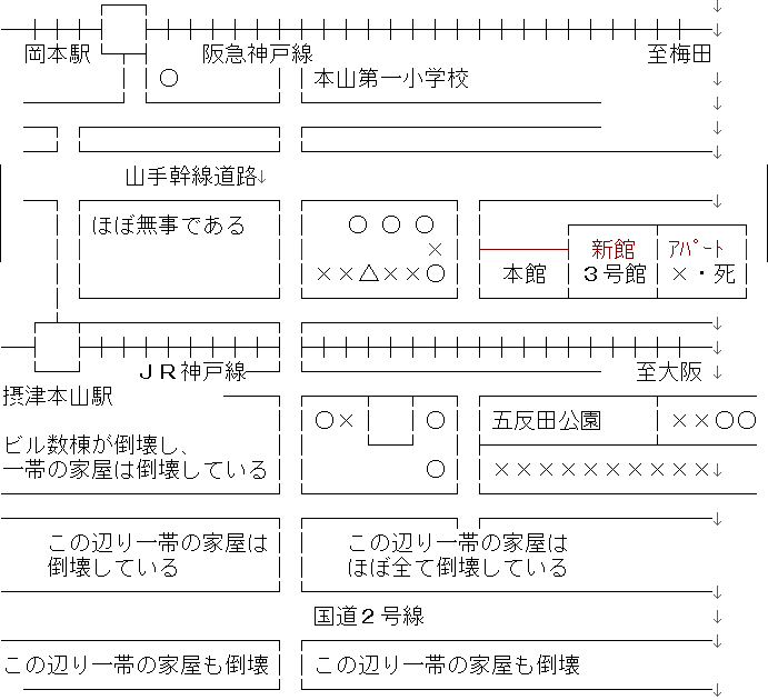 家族の無事を確かめて、すぐさま車で学校に向いましたが、道路という道路には、いたるところに大きな亀裂・隆起・断層が走り、7階建マンションがひっくり返り、5階建のビルは挫折し、夙川の橋橋はいずれも落橋の危険にさらされていました。西宮・苦楽園〜芦屋・六麓荘〜神戸東灘区・森北という山手・高台の全く無傷の地域を経て、7時頃に「本山」にある学校に到着すると、倒壊した下宿先のアパート・マンションから這いずり出してきたといった学生が泣きついてきて、互いの無事を確かめあったのです。小生の自宅真ん前の方方を始め、一帯だけで30数名の方方が亡くなられた状況を思い、無事であったことが不思議です。