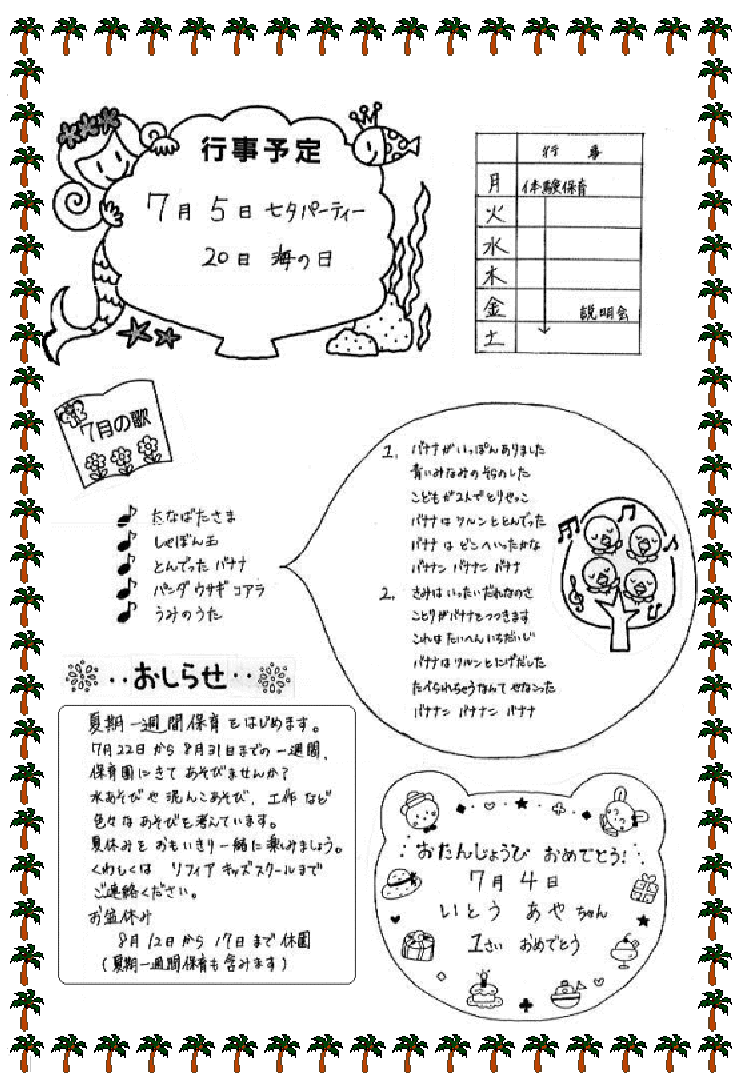 梅雨もあけ夏もいよいよ本番です。 開園して2ヶ月目にはいり、少しずつ笑い声も増え、にぎやかになってきました。 子どもたちは新しいお友だちや先生にも慣れ、園生活をとても楽しんでいます。 心身共に安定しはじめた子どもたちですが、家族と離れた時間を楽しむ反面、不安もでてくると思います。 そこで、夏休みを利用して遠くでなくても家族そろって公園へ行ったり、プールへ行ったりと子どもにとってたくさんの思い出を作ってあげてはいかがでしょうか。また、うたや手遊びなど親から子どもに伝えられてきた遊びを教えてあげるのもいいと思います。 子どもはお父さん、お母さんとふれあい、楽しむことで絆を深めていくものだと思います。もちろん、園でも夏の生活の中での体験をたくさん考えています。たとえば、水遊びやシャボン玉、虫探し、また植物の成長を楽しんでいきます。この体験は子どものこころも体も成長させてくれます。 これから、日差しが強くなり、子どもたちは疲れやすくなりますので、帽子をかぶせ、水分を十分に取らせてあげてください。