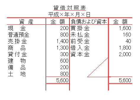 したがって、期末に作成される貸借対照表は、次のような表現方法が用いられています。