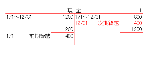 英米式では、上述の手順(イ)(ロ)(ハ)までは同様の手続きを採用するのですが、資産・負債・資本の勘定科目では、仕訳を省略して元帳の上だけで締切りを行ないます。すなわち、元帳の残高が借方残であれば貸方(右)に、貸方残であれば借方(左)に、貸借逆方向に期末の日付でもって「次期繰越×××」と朱記記入して締切る、と同時に、翌期首の日付でもって「前期繰越」と振り戻しておきます。