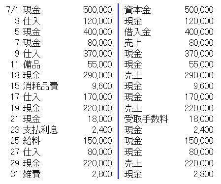 [例題1] 次の取引を仕訳しなさい。 7月1日 A氏は、現金 500,000円を出資して甲山商店を開業した。 3日 尼崎商店から商品 120,000円を仕入れ、代金は現金で支払う。 5日 西宮銀行から現金 400,000円を借り入れた。 7日 芦屋商会に商品を80,000円で売上げ、代金は現金で受取る。 9日 伊丹商店から商品 370,000円を仕入れ、代金は現金で支払う。 11日 陳列棚(備品勘定)を55,000円で購入し、現金で支払った。 13日 宝塚商会に商品を 290,000円で売上げ、代金は現金で受取る。 15日 帳簿(消耗品費勘定)を購入し、代金 9,600円は現金で支払った。 17日 三田商店から商品 170,000円を仕入れ、代金は現金で支払う。 19日 神戸商会に商品を 220,000円で売上げ、代金は現金で受取る。 21日 商品売買の仲介をし、手数料18,000円を現金で受取った。 23日 西宮銀行に対し、借入金の利息 2,400円を現金で支払った。 25日 従業員の給料 150,000円を現金で支払った。 27日 豊中商店から商品80,000円を仕入れ、代金は現金で支払った。 29日 吹田商会に商品を 220,000円で売上げ、代金は現金で受取る。 31日 雑費 2,800円を現金で支払った。 |