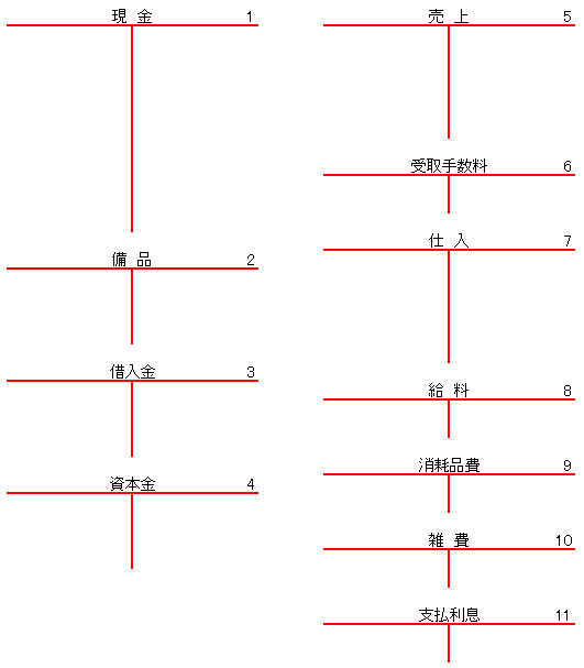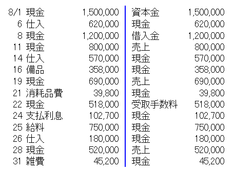 [例題2] 次の取引を仕訳しなさい。 8月1日 A氏は、現金 1,500,000円を出資して甲山商店を開業した。 6日 尼崎商店から商品 620,000円を仕入れ、代金は現金で支払う。 8日 西宮銀行から現金 1,200,000円を借り入れた。 11日 芦屋商会に商品を800,000円で売上げ、代金は現金で受取る。 14日 伊丹商店から商品 570,000円を仕入れ、代金は現金で支払う。 16日 陳列棚(備品勘定)を358,000円で購入し、現金で支払った。 19日 宝塚商会に商品を 690,000円で売上げ、代金は現金で受取る。 21日 帳簿(消耗品費勘定)を購入し、代金 39,800円は現金で支払った。 22日 商品売買の仲介をし、手数料518,000円を現金で受取った。 24日 西宮銀行に対し、借入金の利息 102,700円を現金で支払った。 25日 従業員の給料 750,000円を現金で支払った。 26日 豊中商店から商品180,000円を仕入れ、代金は現金で支払った。 28日 吹田商会に商品を 520,000円で売上げ、代金は現金で受取る。 31日 雑費 45,200円を現金で支払った。 |